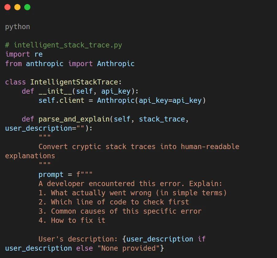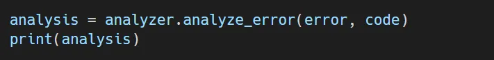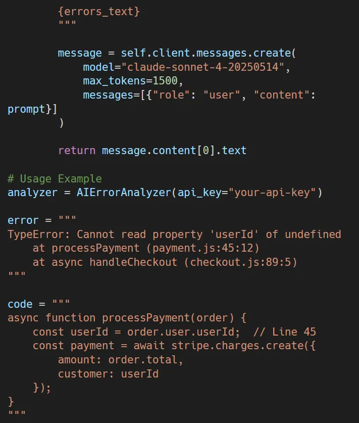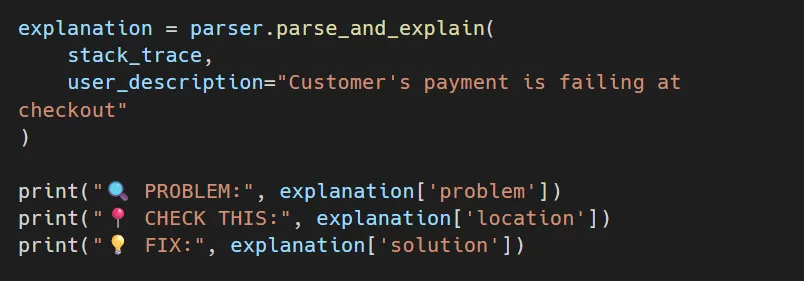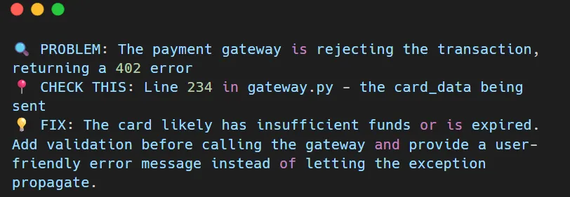 What it does: The AI looks at the error and figures out the order. user is undefined, and tells you to check for null before using nested properties. It also tells you to use defensive programming methods to stop the same thing from happening again.