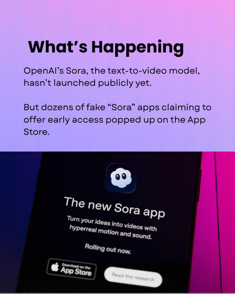 OpenAI’s Sora, a text-to-video model, has not yet debuted publicly, but false apps purporting early access have surfaced. This image illustrates this. It presents a sample app page with a distorted Sora description.
