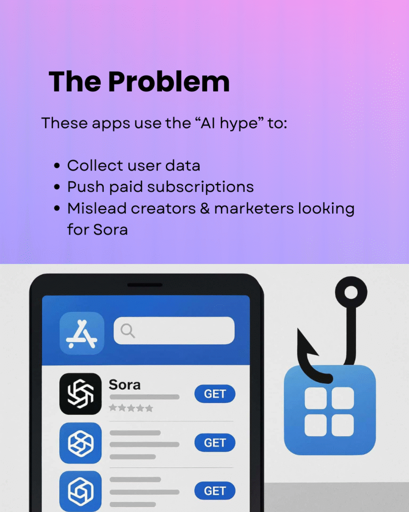 This picture cautions that not all Sora is real by showing the flood of Sora copycat apps on the App Store. It depicts a phone surrounded by several cloud-themed app icons bearing the App Store icon.