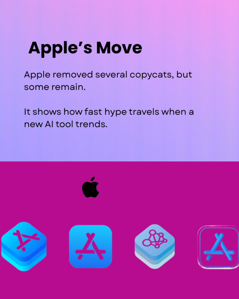 Apple has been cracking down on Sora copycat applications that mimic its own. Still unreleased, Sora is a text-to-video tool. Some of which are still lingering despite Apple’s best efforts, the App Store has seen a flood of bogus applications seeking to profit on the buzz. These impostors are also promoting paid memberships and gathering user data—rather clandestine stuff—and not only confusing artists and marketers. Though some still linger, this picture draws attention to Apple’s attempts to delete many copycat apps from the App Store. Showing the quick spread of AI tool trends, it has the Apple logo next to several app symbols replicating well-known styles.