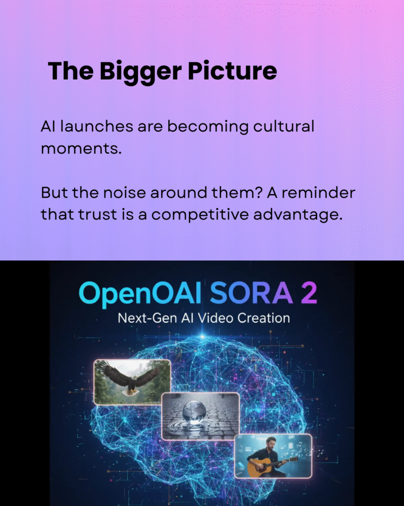 This image highlights how with trust as a main benefit, AI launches such as Sora 2 are evolving into cultural events. It shows a promotional graphic for OpenAI Sora 2 that has original video production graphics.