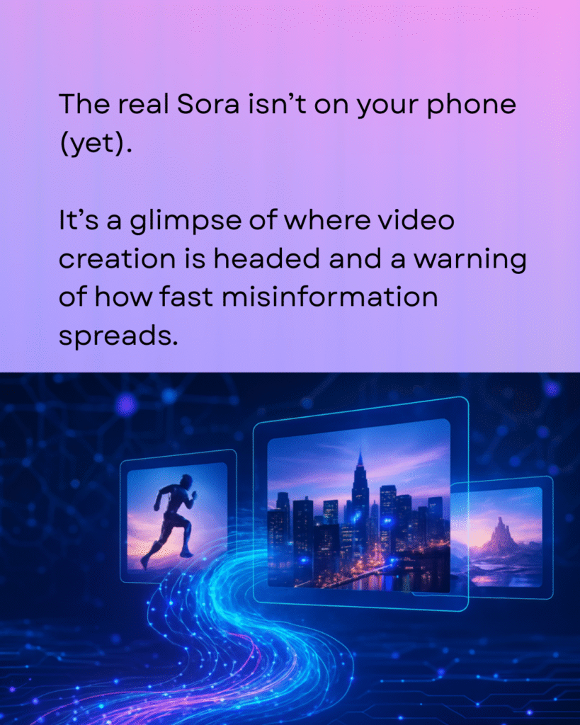 This picture examines the rush for artificial intelligence and highlights the need for great digital literacy, product identification protection, and user verification. It offers a bright Sora 2 promotional image with varied video material.