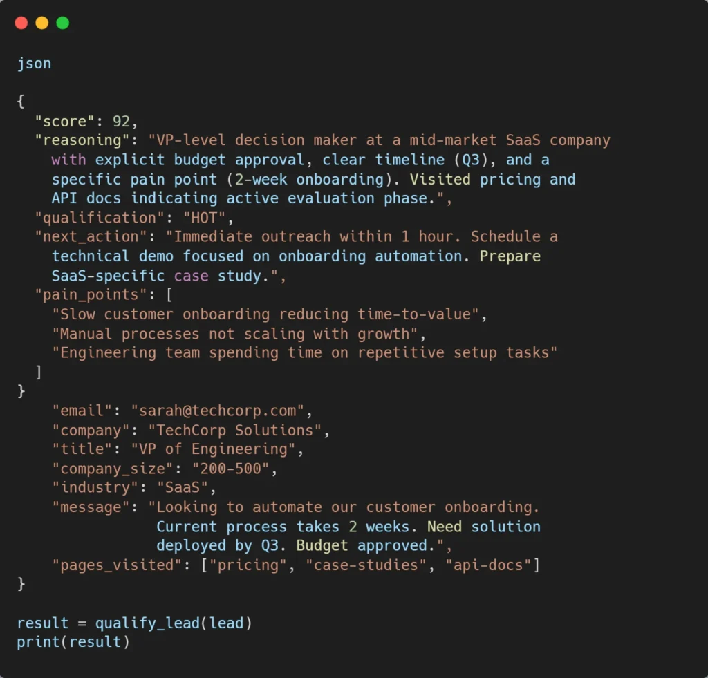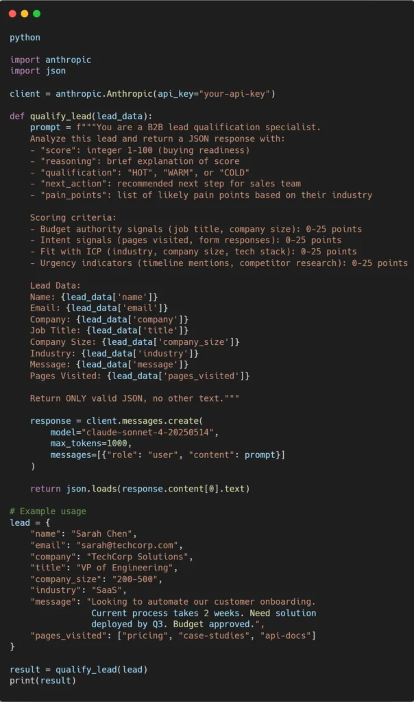 The Anthropic API accepts structured prompts and returns intelligent analysis. Here’s a working Python example that scores a lead: