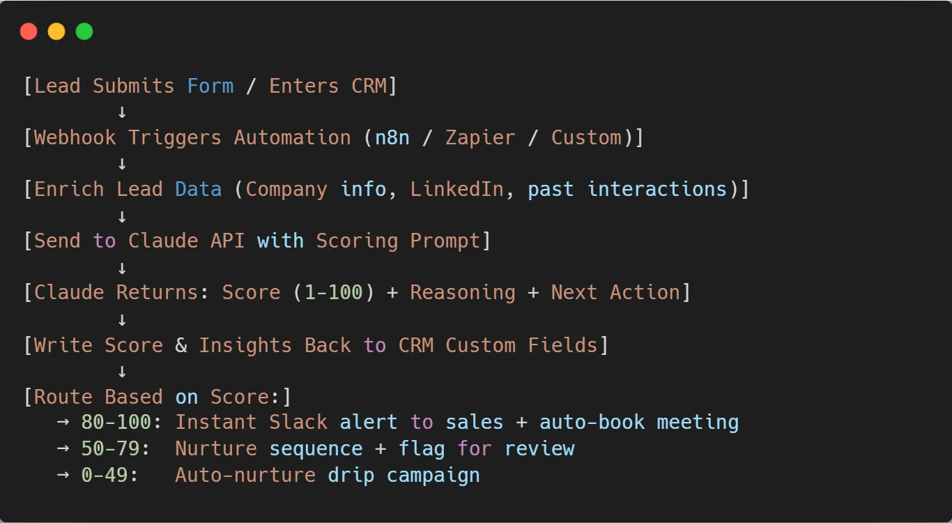 A lead who visited your pricing page three times in 24 hours and searched for “implementation costs” is a fundamentally different prospect than one who casually browsed a blog post. Traditional CRM scoring treats them almost identically. Claude doesn’t.