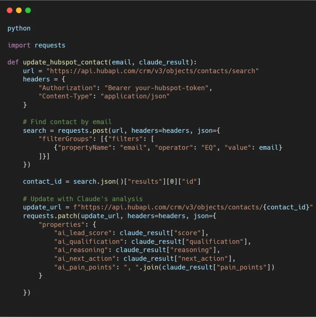 Once Claude scores the lead, push the data back to your CRM as custom fields. Here’s how it works with HubSpot: