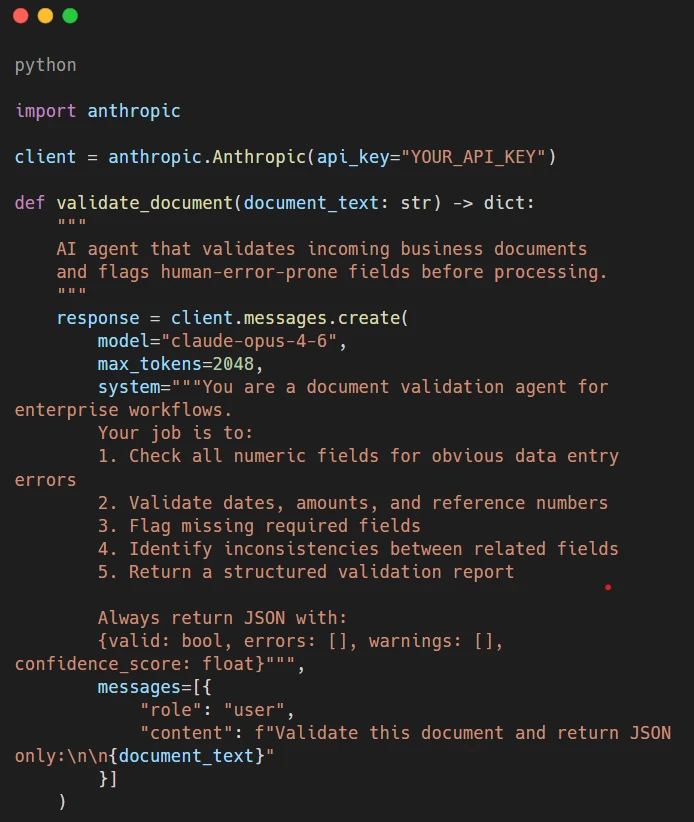 Here’s a practical example — an AI-powered document validation agent that catches data errors before they enter your systems: