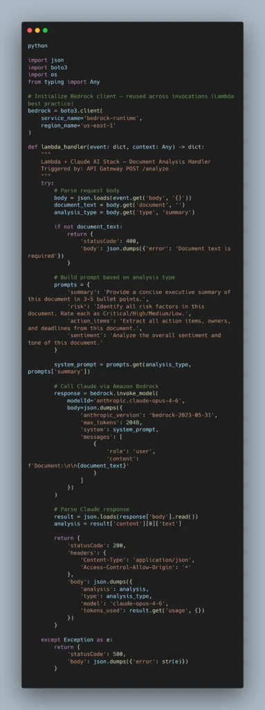 Here is a production-ready Lambda function that handles document analysis using Claude via Amazon Bedrock: