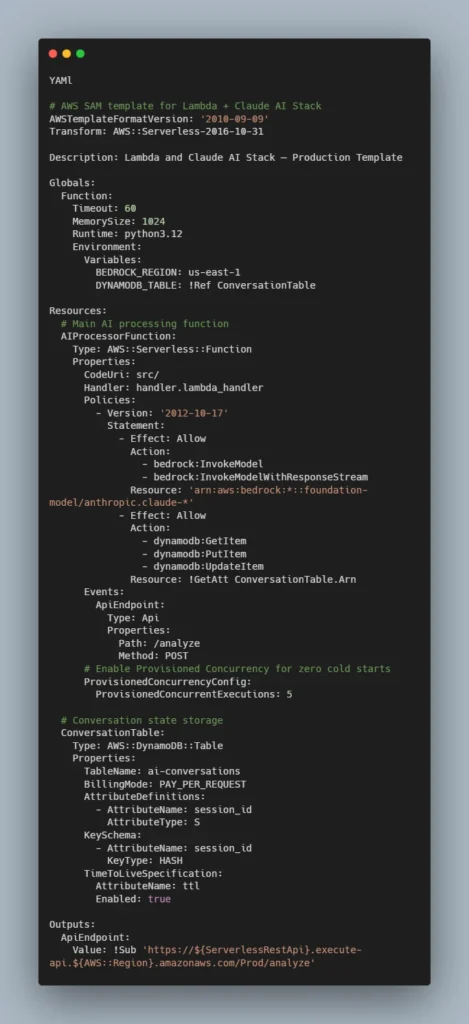 Provisioned Concurrency eliminates cold starts by keeping execution environments pre-initialized. For latency-sensitive production endpoints — customer-facing chatbots, real-time document analysis, voice interfaces — enable Provisioned Concurrency on your Lambda function, and cold starts become a non-issue entirely.