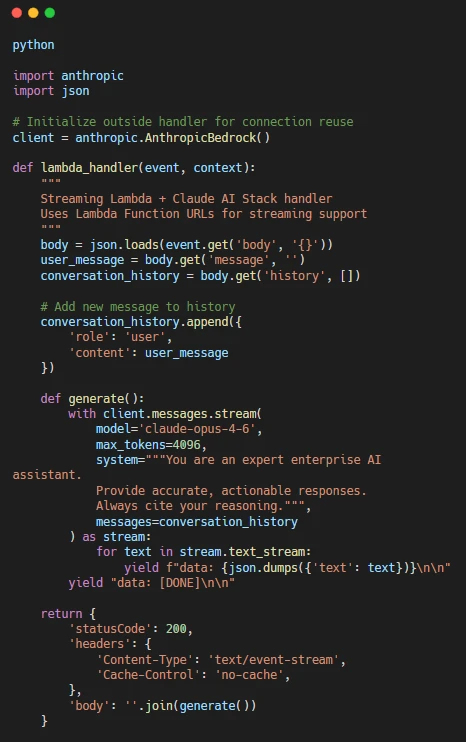 For conversational AI applications where response time matters, Lambda supports streaming via Function URLs — bypassing API Gateway’s 29-second timeout limitation: