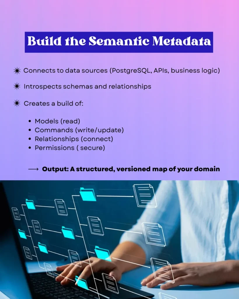 Semantic metadata is the building block that establishes connections to various data sources, whether it is a PostgreSQL database, API, introspective schemas, models, commands, relationships, permissions, etc. The outcome is now standardized and versioned a map within your domain that organizes and secures the AI ecosystem.