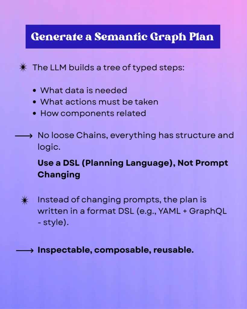 Semantic graphs a LLMs to create a logically structured tree of action that identifies missing data, required action, and the relationships between components. This prevents loosely constructed chain of actions by forcing logic, structure, and organization with its own specific DSL, that is, YAML with GraphQL-style syntax. This results in plans that can be inspected, composed, and reused while maintaining consistent performance from the AI-brain.