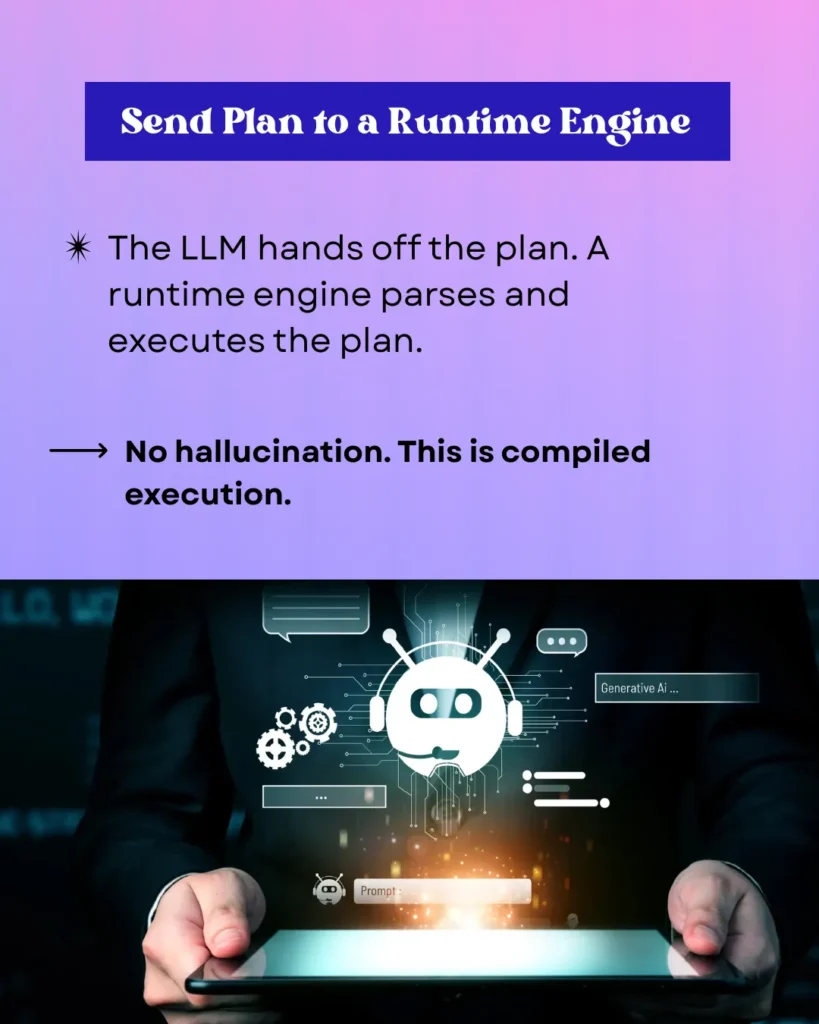 Once the plan is created, the LLM sends the plan to a dedicated runtime engine to parse and execute. Transformers are auto-compiled code, which eliminates the possibility of hallucinations and ensures certainty, as it implements deterministic execution using auto-compiled code instead of unpredictable prompt-based responses.