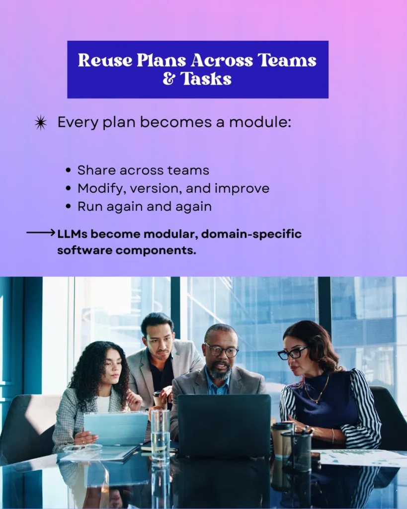Each plan in the semantic graph evolves into a modular component, providing the ability to share, change, version, and run again on different teams. This modularity allows for LLMs to become software building blocks in a domain, enhancing collaboration on and long term efficiency for AI projects.