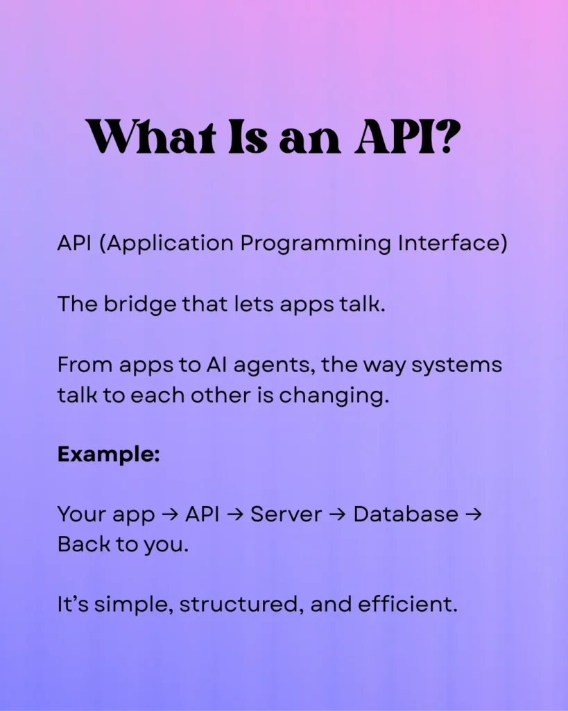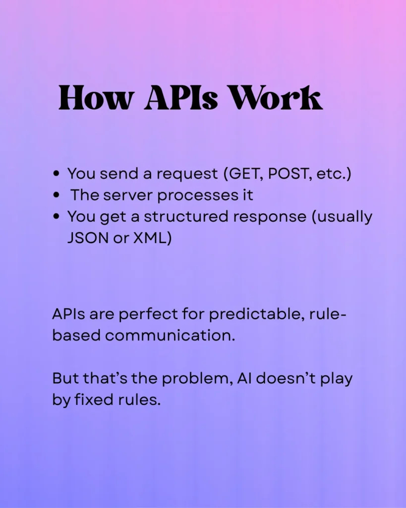 An API (Application Programming Interface) serves as a means for applications to communicate efficiently with servers and databases. It offers an orderly and straightforward framework, but it does not have the flexibility that is now required by AI.
