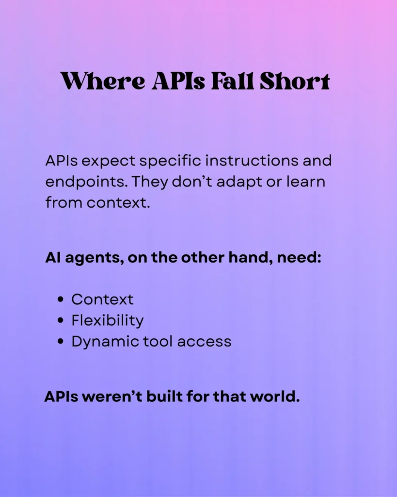 APIs struggle with the AI’s need for context and flexibility for the user, which they cannot provide, and that the MCP is designed to provide by facilitating access to a dynamic set of tools.