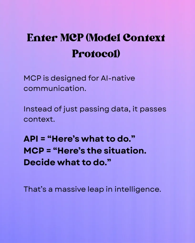 MCP provides contextual information so that the AI can determine what to do, representing an enormous step forward from API’s command approach to intelligent communication based on situations.
