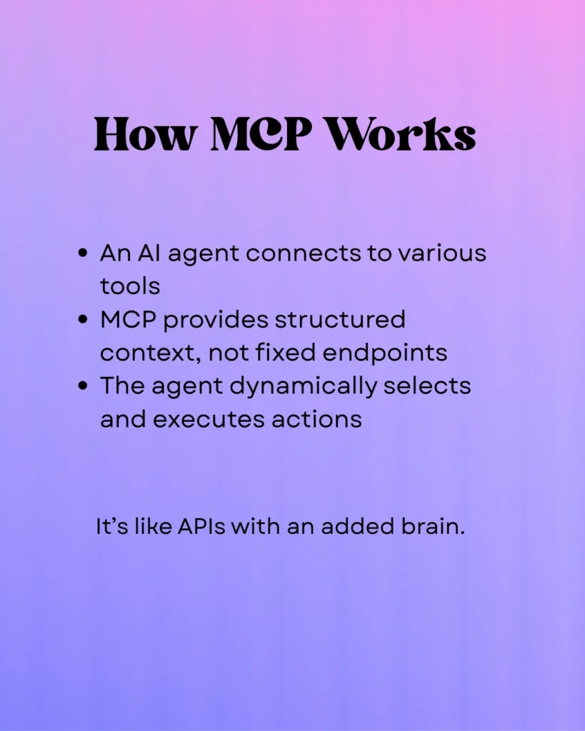 Mobile Context Proxies (MCP) connects AI agents to multiple tools through a standard protocol to provide context for choosing actions dynamically. It’s like an API with smarts, augmenting workflows with context by meaningfully customizing tools in real-time.