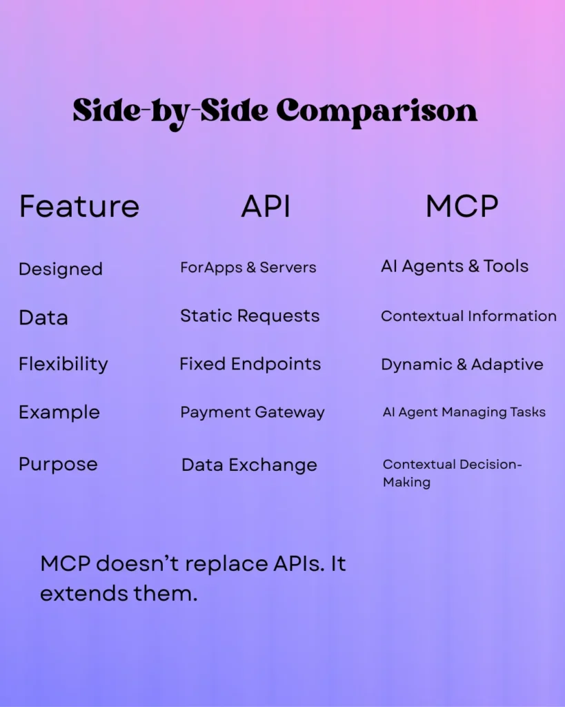 A visual juxtaposition of APIs that are static requests with fixed endpoints and MCP’s contextual and dynamic approach to interaction, identifying role differences in data exchange versus decision-making.