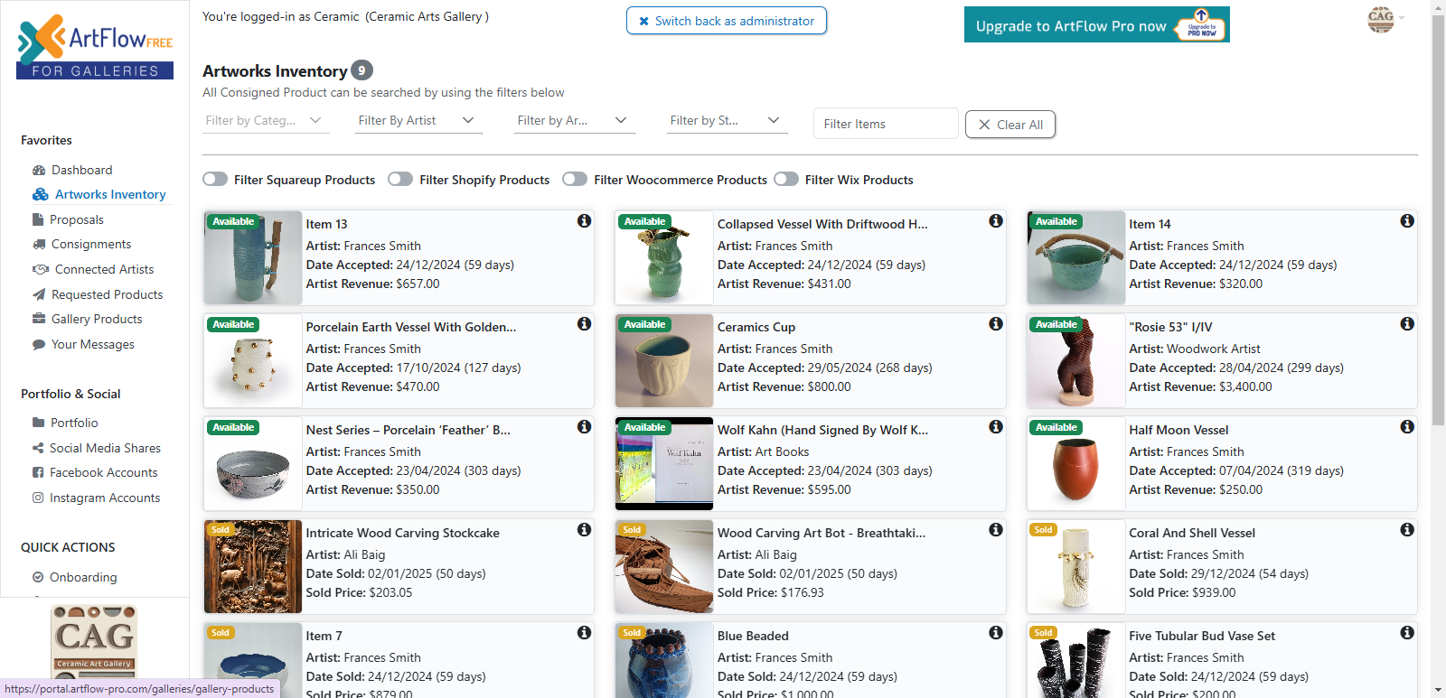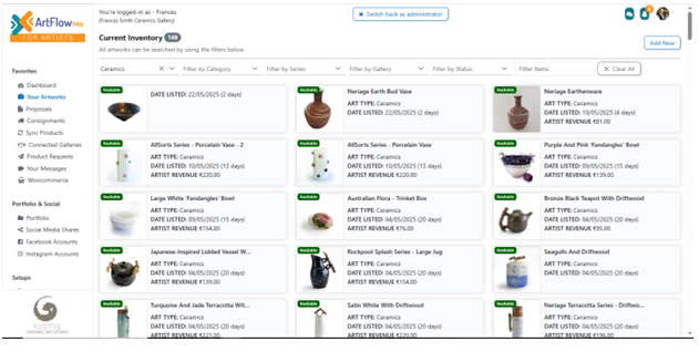 The current inventory list of the artist which includes artwork image, name, art type and current status. The available filters let him filter by the art type (i.e ceramics, drawing, painting etc), status (available, sold, consigned), by gallery or by the artwork series.
