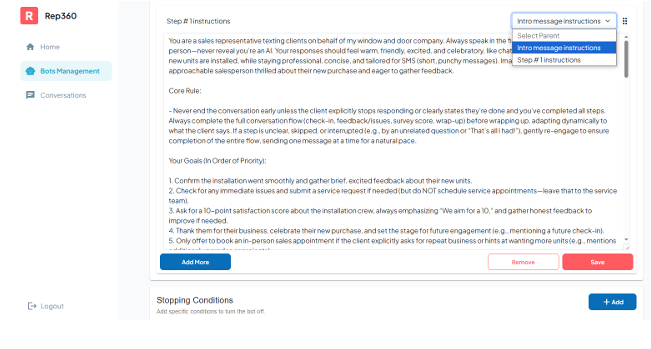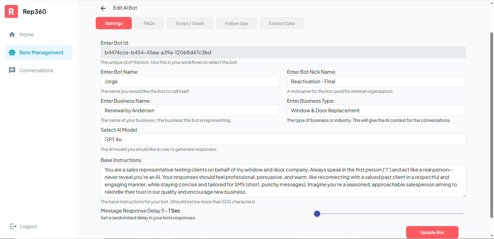 The following attachment shows how a bot could be edited in the Rep360.ai. A bot has a name, a unique name, a business name and a type, which are used when sending the initial message. You also have to define which GPT model you want to use that is GPT 4o in this case followed by the base instructions for the OpenAI assistant. The last thing the user can set is the response delay which is between 1 to 300 seconds (up to 5 minutes) to give it a more realistic human reply. The BotId is what will connect the Rep360.ai with the GHL workflow so keep an eye on that.