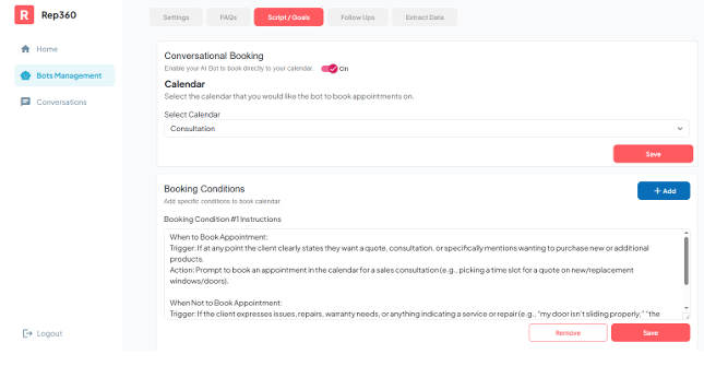 - The passing of information TO and FRO from GHL to Rep360 and back. The multiple things that needed to be checked were if the booking conditions are met and if they are, pass the agent’s availability on the selected calendar. Give users 3 times from the available slots in the selected timezone (which caused a lot of issues). Once everything was met, a booking would be added to the GHL’s calendar of the agent. Similarly, stopping conditions, scripts, follow-up messages and times, issue extractions and tags management on the lead were a few others that should get a mention here.