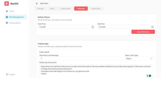 The follow ups are next thing in this configuration puzzle. The active hours are the hours for this bot in which it will be active so in the given screenshot, the bot will only reply or generate messages between 7 to 9PM PST. The follow ups defined in the second half of the screen gives users the ability to set the frequency and the instructions. For example, send the following message after 7 days of no-reply from the customer. User can define multiple of these follow ups.