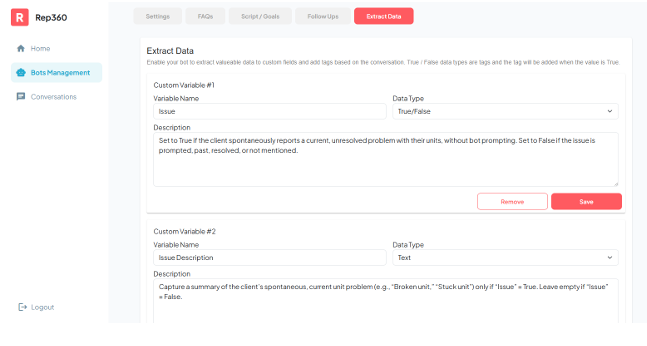 - Identifying the right variables. This was one of the benchmarks of this product if it was successful or not at the time of delivery. All variables had a descriptive condition and an outcome value. For example, here’s the condition “Set to the client’s follow-up date in MM-DD-YYYY format if they provide a specific date or timeframe (e.g., “03-15-2025,” “6 months” = 6 months from conversation date). Default to 6 months from conversation date if unclear. Leave unset if no follow-up is requested or declined”. If it is met, set the value in a variable called “Follow Up Date” which will then be added as a tag on the lead for further processing.