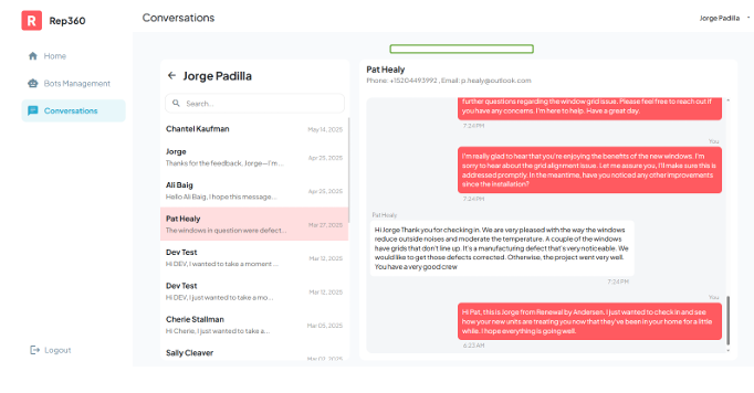 Example: Hi Jorge, this is Jorge from Renewal by Andersen. I just wanted to quickly check in after your installation. How did everything turn out?