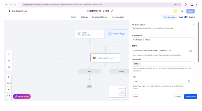 After we have configured everything inside the Rep360.ai, its time to now setup the GHL workflow. For that, we created an application with a custom action. The inputs of this action is the BotID which is the ID of the bot in Rep360 and the list of communication channels which in 99% of cases will be SMS. The action’s configuration in the development console allows you to configure the webhooks and other important things behind the screen.